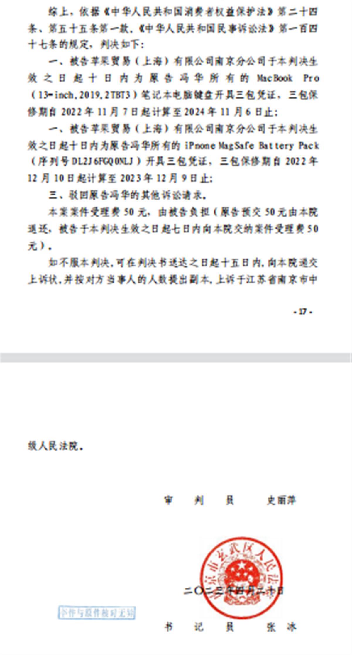 2023年4月20日,南京市玄武区人民法院做出一审判决,判令苹果南京分公司于判决生效之日起10日内为原告冯先生所有的MacBook Pro(13-inch,2019,2TBT3)笔记本电脑键盘开具三包凭证,三包保修期自2022年11月7日起计算至2024年11月6日止。