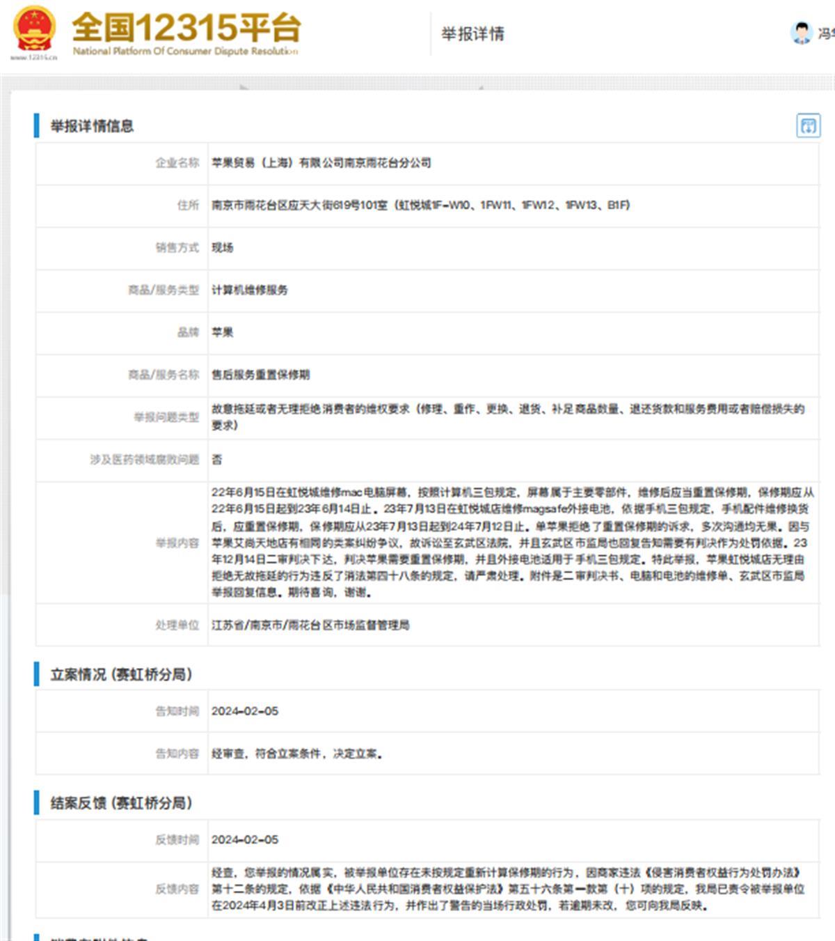 冯先生向极目新闻记者介绍,他依据相关法律法规和上述法院判决,还向南京市雨花台区市监局投诉了苹果南京雨花台分公司,应对他笔记本电脑的屏幕也作出重置保修期处理。市监局回应称,他举报的情况属实,被举报单位存在未按规定重新计算保修期的行为,因商家违反《侵害消费者权益行为处罚办法》第十二条的规定,依据《中华人民共和国消费者权益保护法》第五十六条第一款第(十)项的规定,该局已责令被举报单位在2024年4月3日前改正上述违法行为,并作出了警告的当场行政处罚。