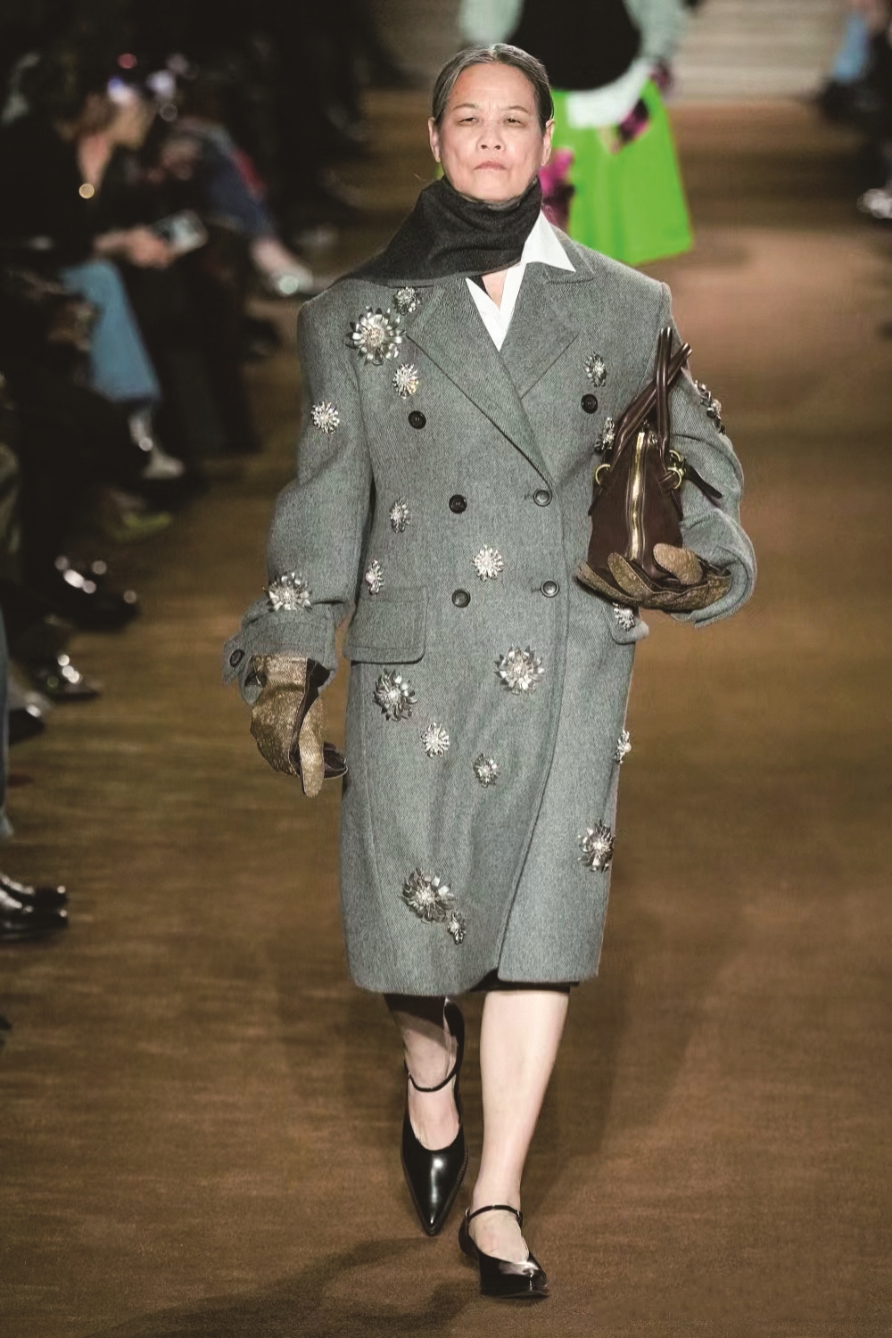 3月初,覃女士受邀去了趟巴黎。在本季的巴黎时装周上,她身着灰色大衣、黑色尖头高跟鞋,以围巾、手套、手袋作为配饰,出现在了MiuMiu2024秋冬巴黎时装周的T台上。覃女士的个子不算高,身材还偏胖,头发已经灰白,但她由内而外散发出来的自信与干练征服了观众。