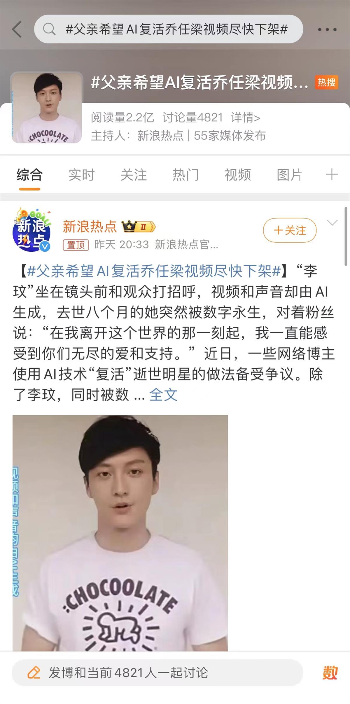 3月16日,#父亲希望AI复活乔任梁视频尽快下架#话题登上微博热搜。据报道,乔任梁父亲看到网上传播的视频后表示,无法容忍AI技术使儿子复活,这让他感到极度不适,“我希望对方能尽快将视频下架,他们未征求我们同意,这是在揭伤疤。”