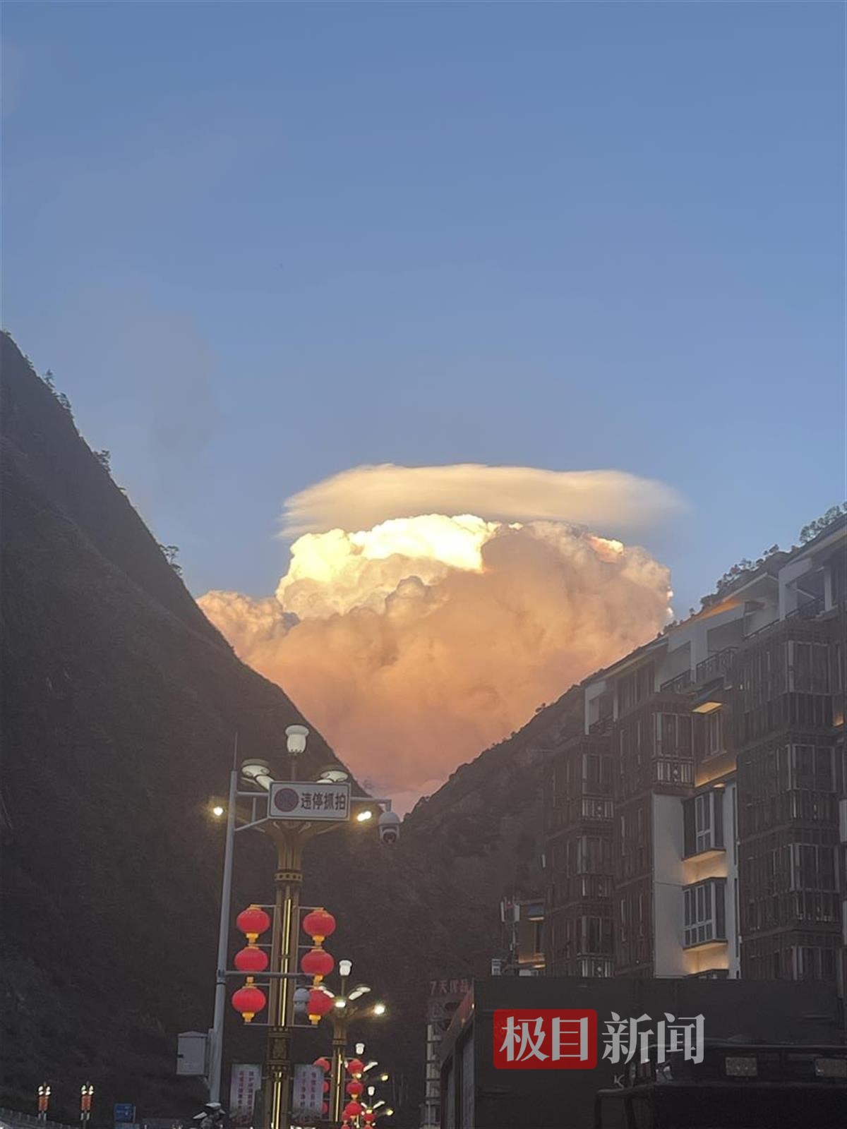 轰鸣声中,有行人在街边驻足,仰头看向围绕县城的山间。河谷方向的山间,升起一大团烟雾,在夕阳余晖照耀下,让人一时之间分不清是山火的烟雾,还是云。