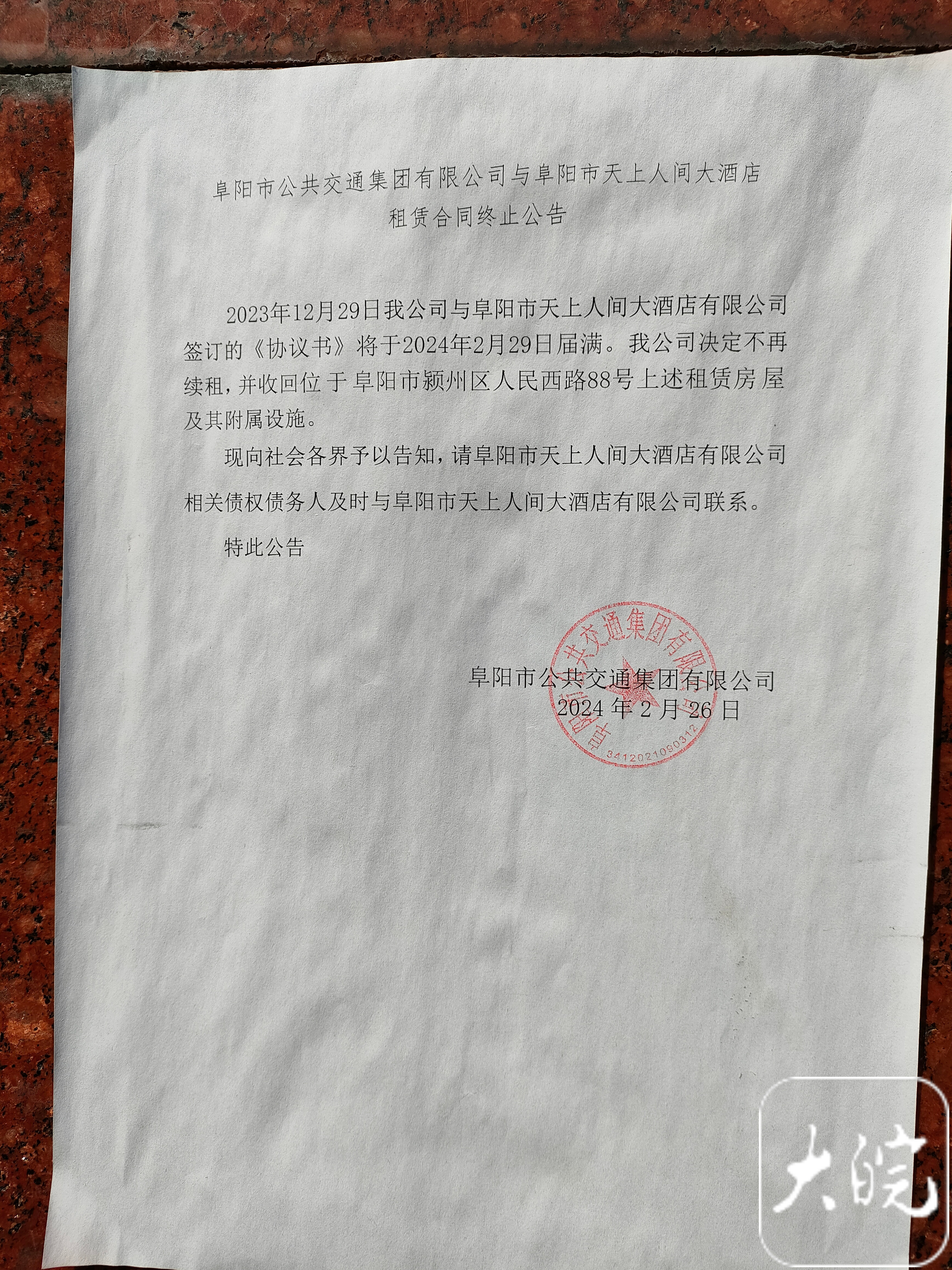 这家酒店为啥撤场?记者咨询现场人员获悉,原址将有新的酒店入驻。在入口处阜阳公共交通集团有限公司与阜阳市天上人间大酒店租赁合同终止公告上,记者看到,阜阳公交集团与阜阳市天上人间大酒店有限公司签订的协议将于2024年2月29日届满,阜阳公交集团决定不再续租,并收回位于颍州区人民西路88号上述租赁房屋及其附属设施。