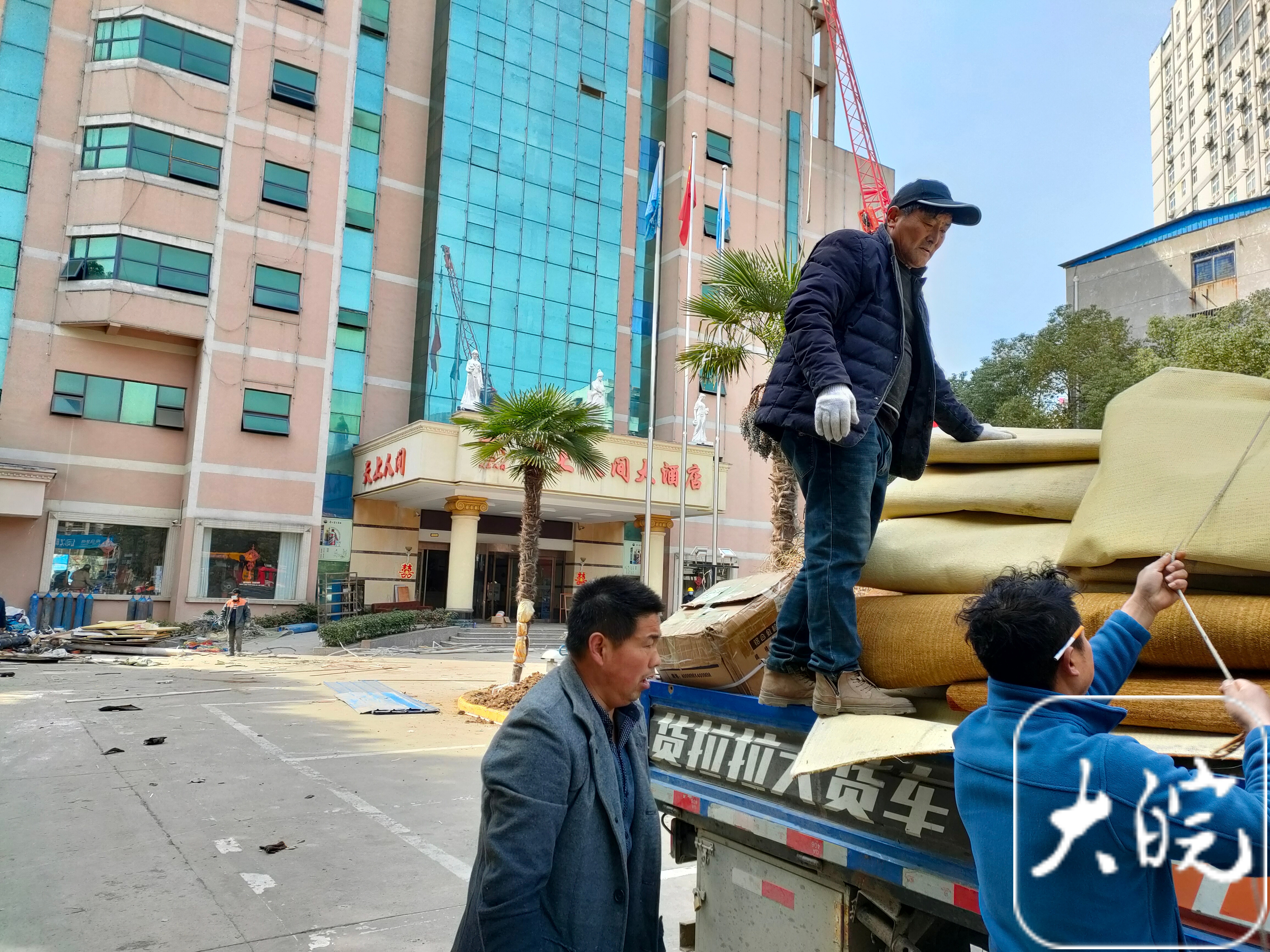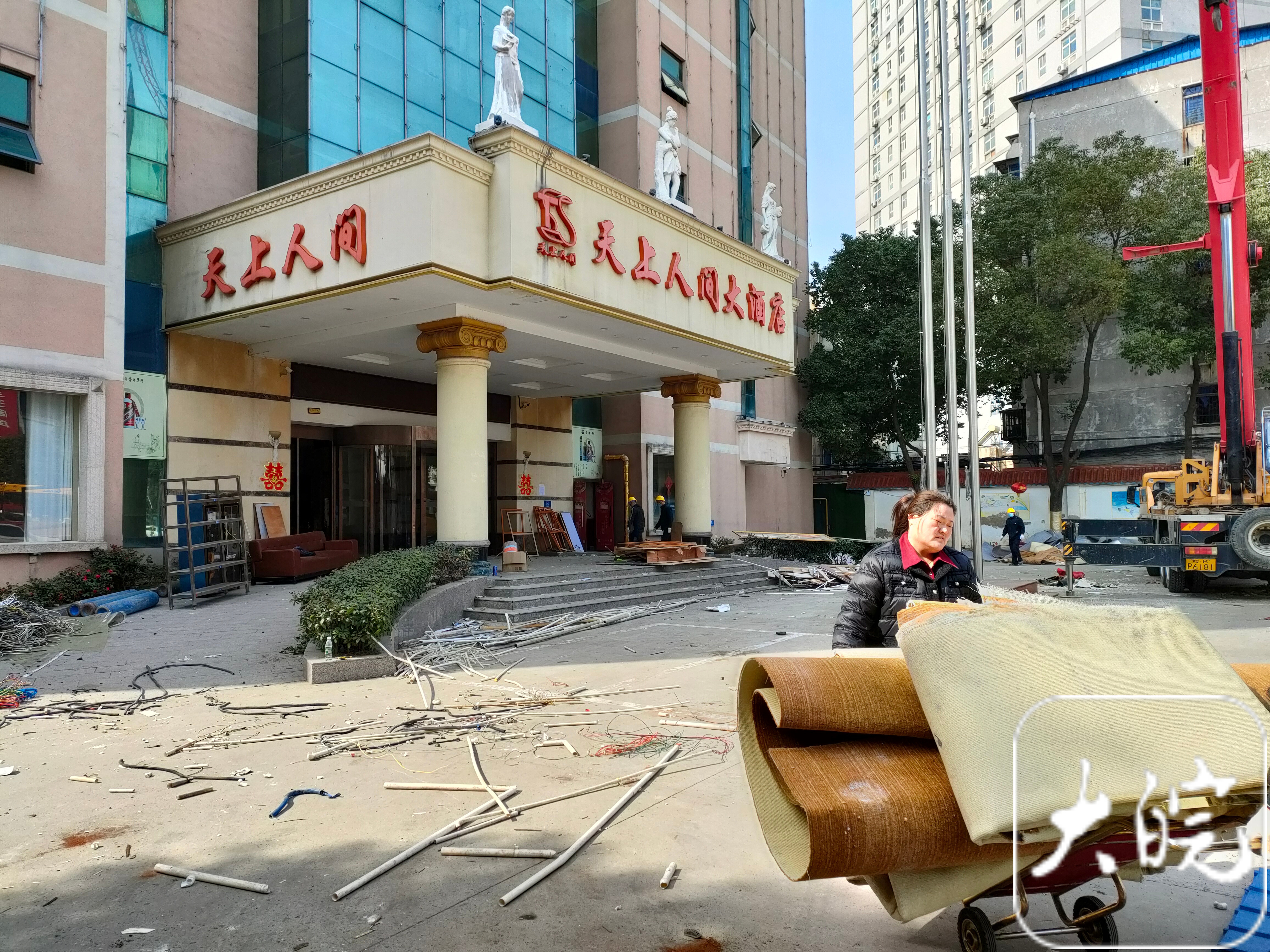 3月19日,记者来到天上人间大酒店看到,酒店大门大开,酒店栅栏外面工人正在加固一二高绿色围档,将酒店包围起来。酒店院里堆着不少撤出的桌椅、门窗等物品。大厅前,工人正将原酒店内的物品运离,还有不少市民前来购买处理物品。