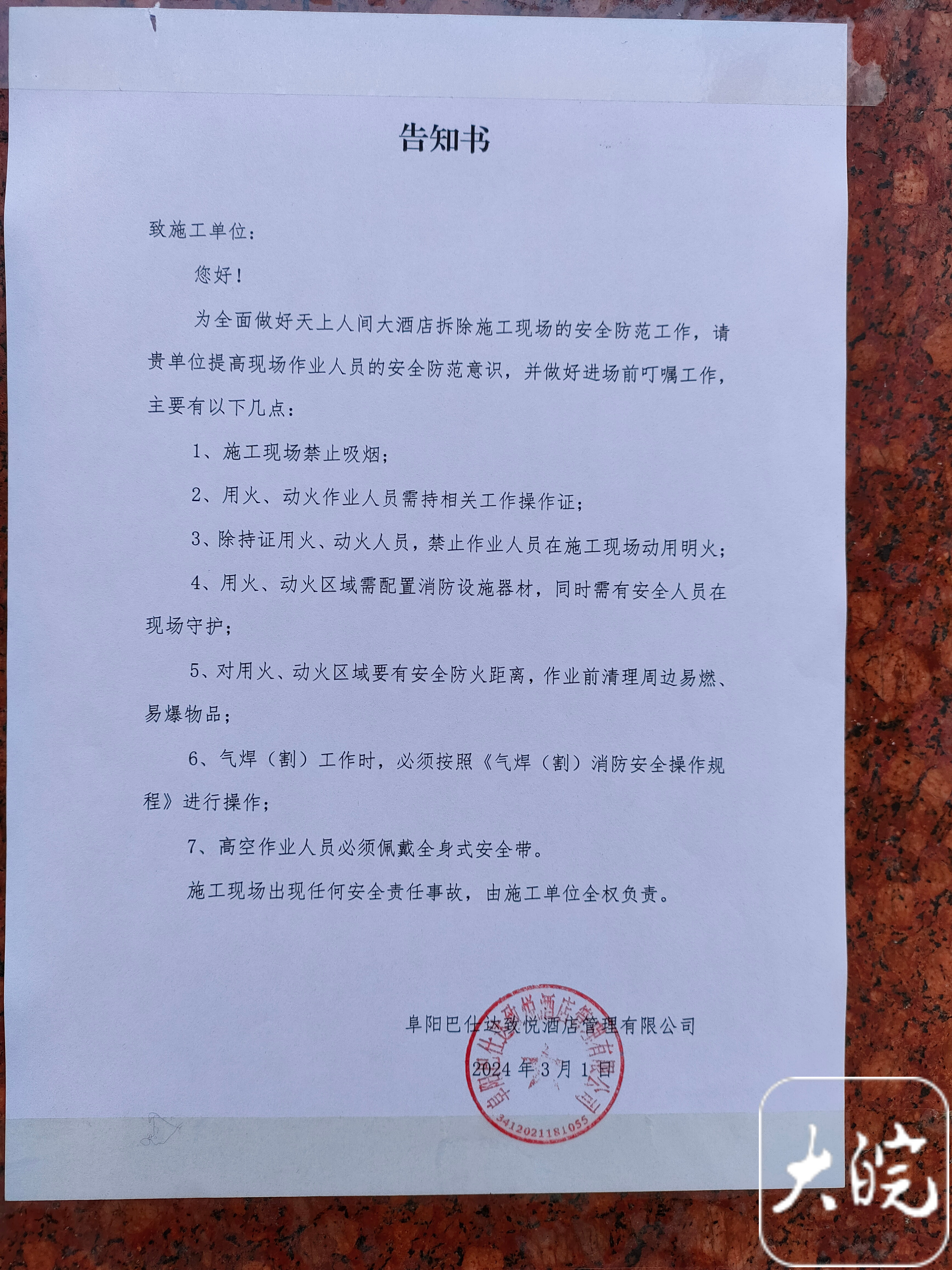 “天上人间大酒店有20年左右了,将来入驻方为巴仕达·致悦酒店。”3月19日,一名知情人告诉记者,当天他也是在这里随便看,比较关注酒店这个行业,他在阜阳多家星级酒店当过经理,目前还在一家酒店干,工作有30多年了。