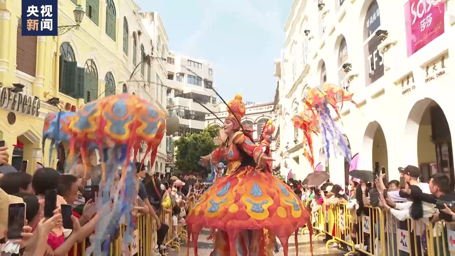 总台记者刘冰清:大巡游的队伍穿行于澳门的大街小巷,风格各异的艺术装置和文化表演不仅给沿途的市民和游客呈现了一场奇幻的文艺之旅,而且也向世界展示了澳门独特的城市魅力。