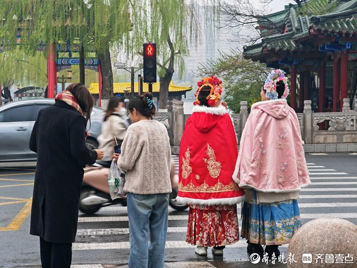 家家流水户户垂杨,在采访中,不少市民游客对簪花与济南的适配程度点赞。游客王女士表示:虽然是个下雨天,但是做完妆造以后特别惊喜,跟想象中的一模一样,再加上下着小雨,走在老街上拍出照片来更有氛围了。“我感觉簪花太适合济南了,穿着汉服、戴着簪花走在泉水旁边拍照太应景了,尤其在济南的老城区,很有代入感,拍出照片来也好看。”市民高女士说。
