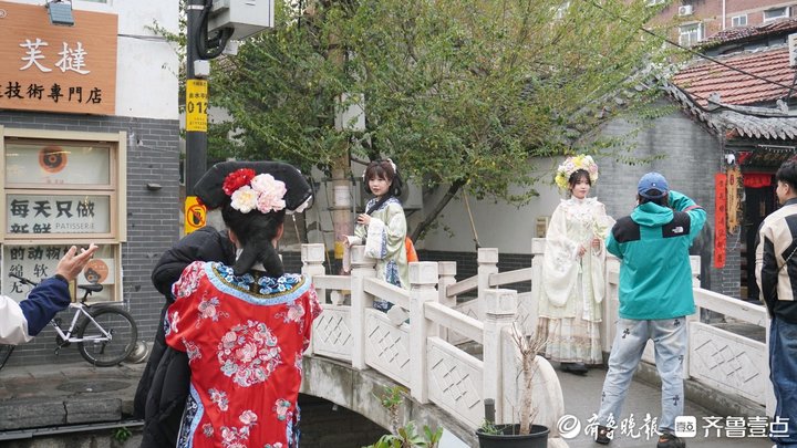 阳春三月,春暖花开,身穿汉服,头戴簪花的市民游客逐渐将济南的街巷点缀得五彩斑斓。在曲水亭街附近一家汉服体验馆,甚至天还没亮就已经有游客排起了长队。
