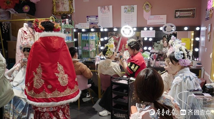 高秋彩介绍,自其2012年接触汉服以来,已经在济南开了四家汉服体验店,“此前我们是专门做汉服租赁、跟拍的,到2023年十月份簪花开始在济南火起来的,我也是去泉州学习了做簪花的方法。每天看到顾客们化上美美的妆,开开心心、漂漂亮亮的,我就特别自豪。”选衣服、化妆、做簪花发饰……一套下来需要将近一小时的时间,高秋彩介绍,每天有许多游客远道而来专程来做簪花妆造,但目前店内每天可以接待40位人员左右,有需求的顾客数量远大于此。