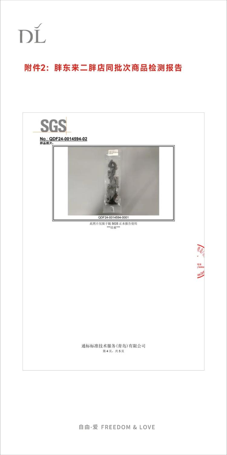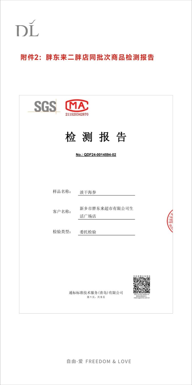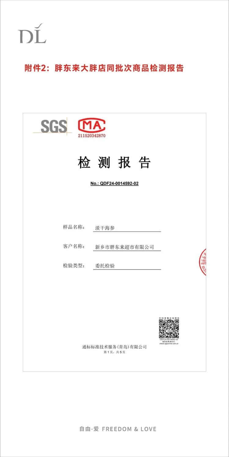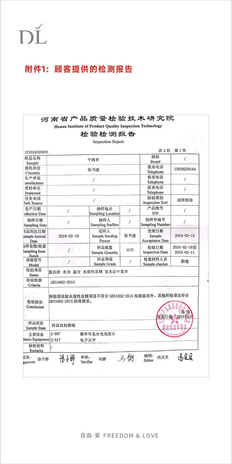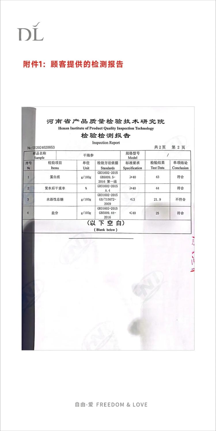 3月15日,公司将两店超市封存的同批次商品送至通标标准技术服务(青岛)有限公司进行检测,该机构具有CMA和SGS认证(CMA检验报告适用于产品质量评价成果及司法鉴定,具有法律效力、SGS代表全球通行的测试和认证机构),检测标准为海参国家标准(GB31602-2015);