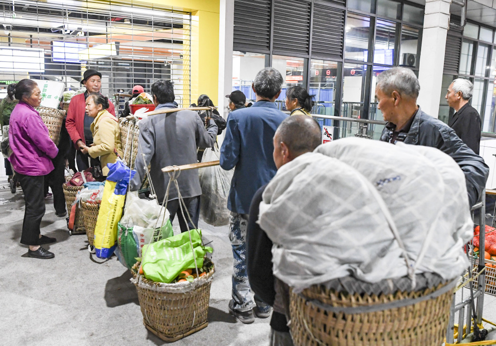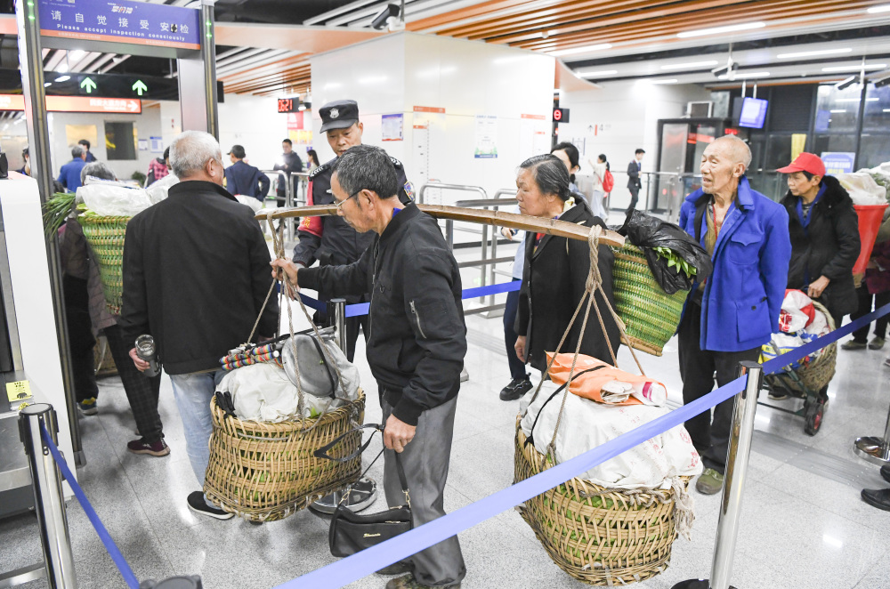 为方便菜农,地铁站工作人员会提供力所能及的帮助:提前打开闸门,引导菜农乘坐升降电梯,引导他们快速有序进站,用手持金属探测仪为他们安检……菜农们乘坐“背篓专线”,去城区各大菜市场。不少菜市场专门设置“农民背篼菜区”,为菜农们售卖农产品提供便利。