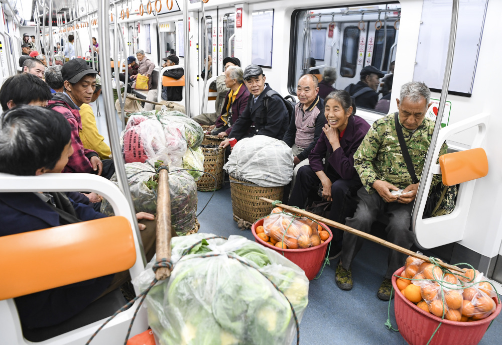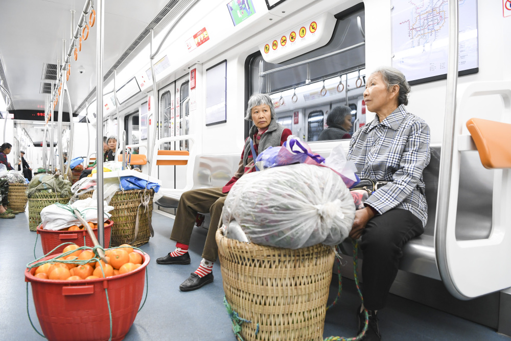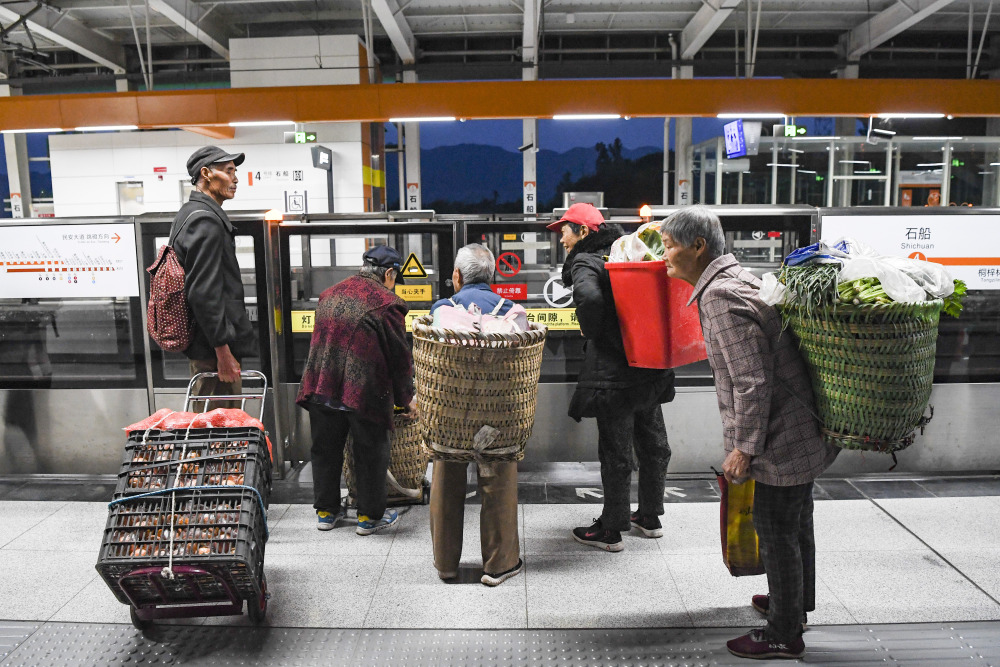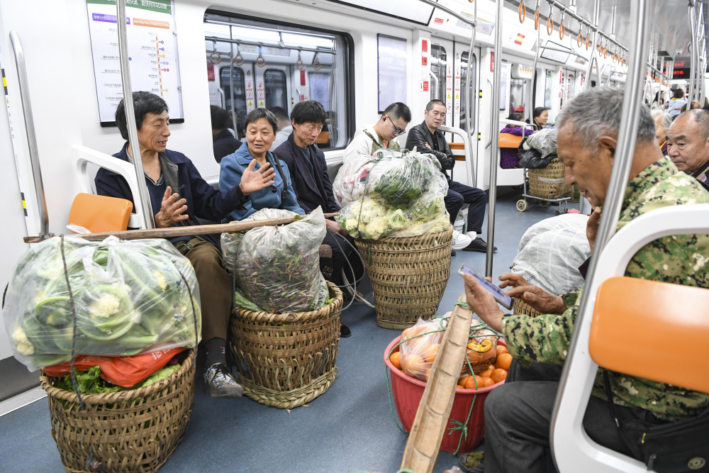 3月27日清晨,菜农乘坐重庆轨道交通4号线,准备前往城区的菜市场售卖农产品。新华社记者 王全超 摄