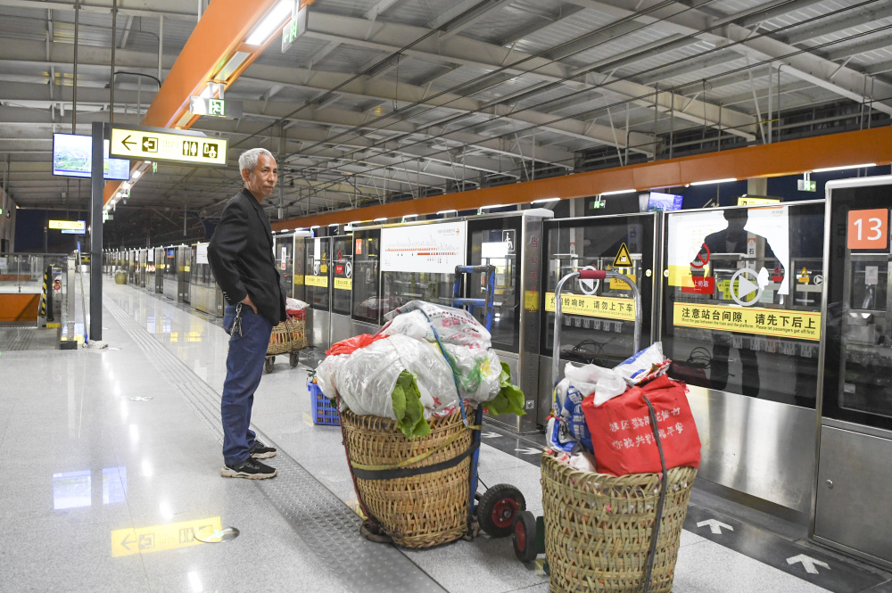 3月27日清晨,在重庆轨道交通4号线二期石船站,菜农在站台候车。新华社记者 王全超 摄