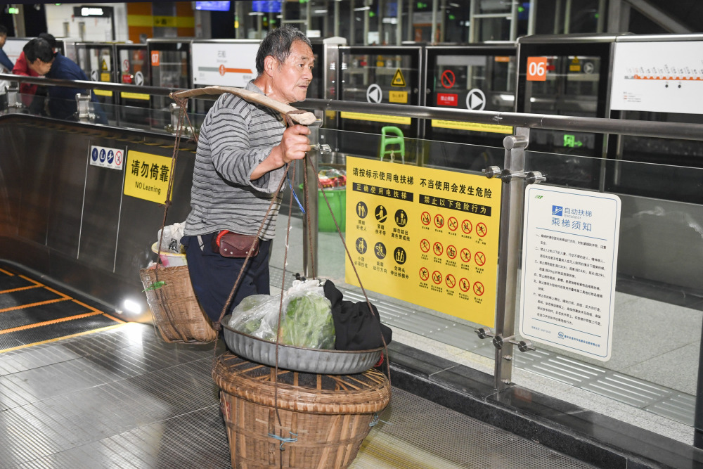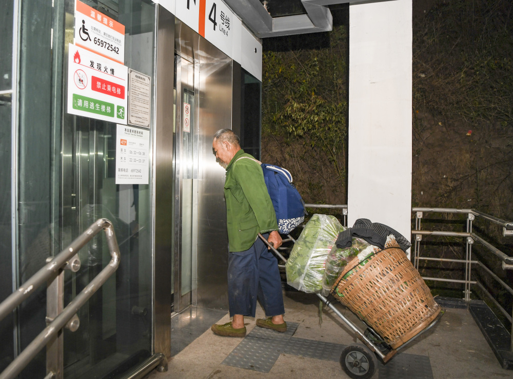 3月27日清晨,在重庆轨道交通4号线二期石船站,渝北区石船镇角口村村民陈仁均拉着蔬菜,准备乘坐电梯进站。新华社记者 王全超 摄