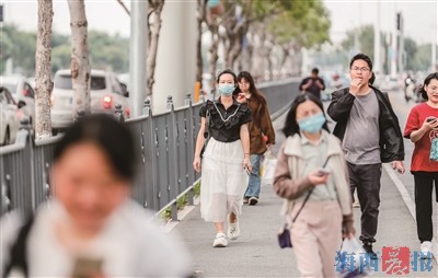 昨日,厦门街头的行人穿“混搭装”出行。记者陈理杰摄