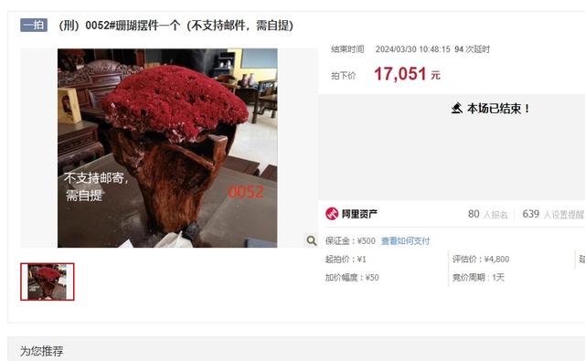 这两件特殊的拍品引起众多人的关注。截止到3月30日,共有52人报名参拍(刑)0055#珊瑚摆件,80人参拍(刑)0052#珊瑚摆件。经过激烈竞争,两件珊瑚摆件分别以 21301 元和17,051 元溢价成交。
