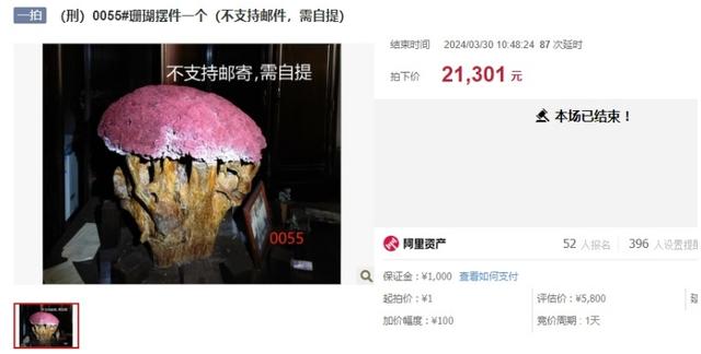 大皖新闻讯3月30日上午,浙江省海盐县人民法院在淘宝刑事案件涉案财物司法拍卖网络平台上进行公开拍卖两件珊瑚摆件制品,起拍价为1元,成交价分别为21301元和17051元,成交价比起拍价溢价上万倍。