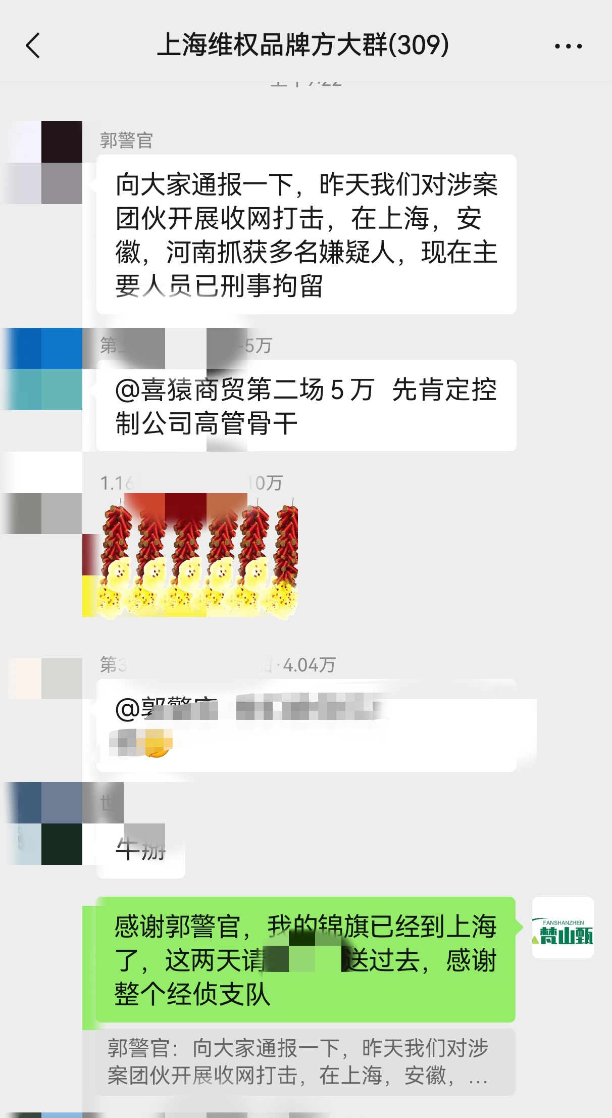 郭警官在维权群里告知众商家,警方在上海、安徽、河南抓获多名嫌疑人,现在主要人员已被刑事拘留,正全力追赃挽损。记者在王云提供的上海公安网信息里看到,6人被刑事拘留。