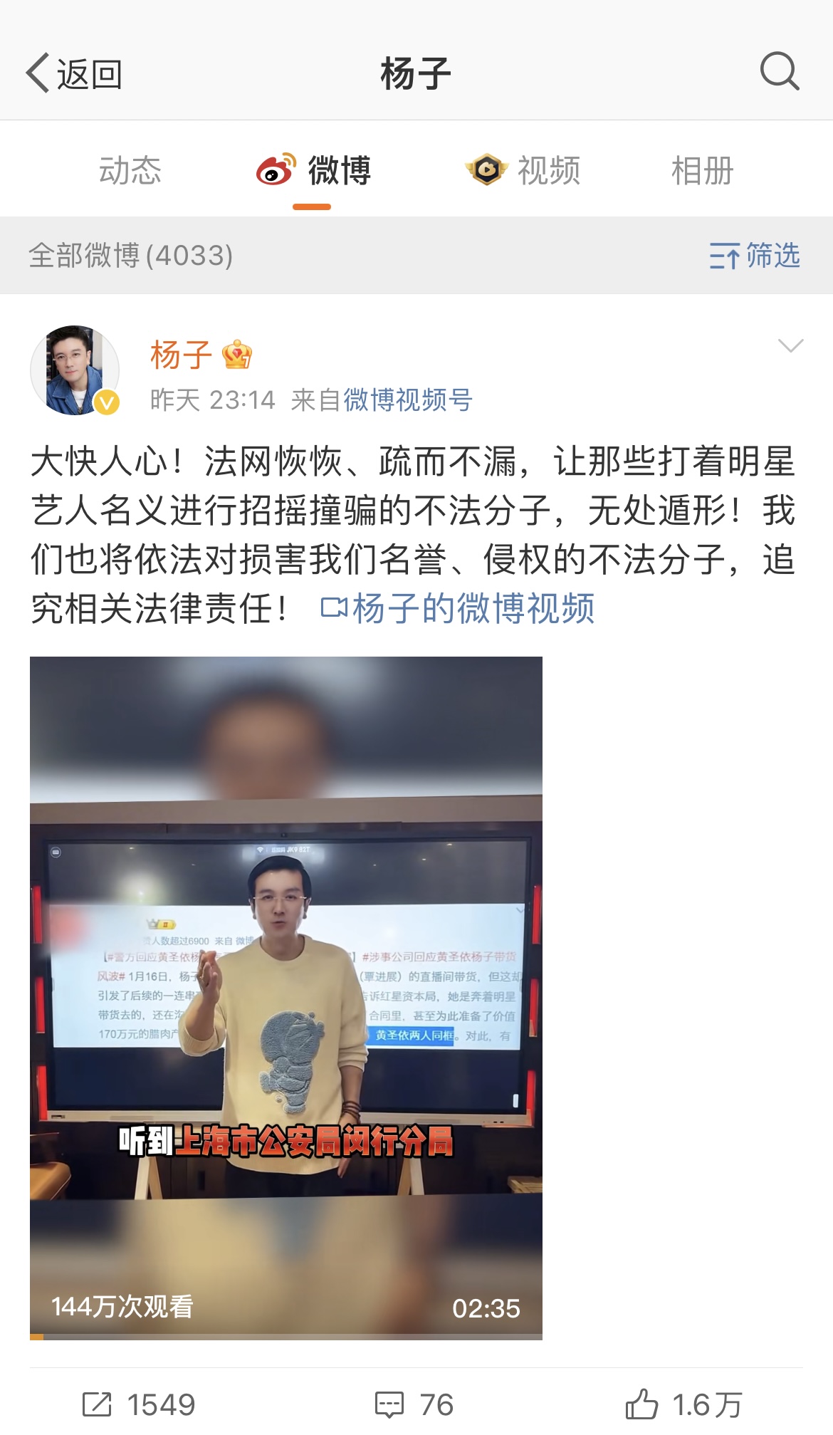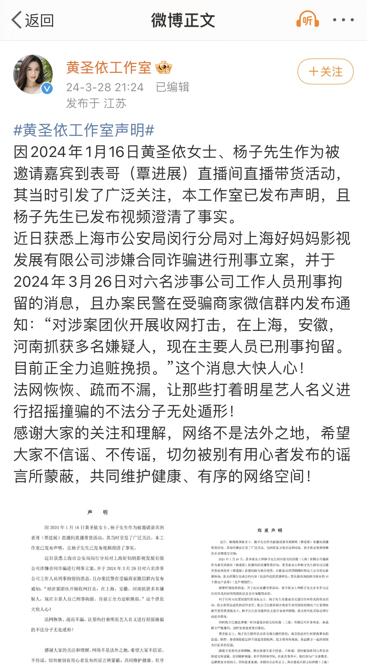 黄圣依工作室同样发文称:因2024年1月16日黄圣依女士、杨子先生作为被邀请嘉宾到表哥(覃进展)直播间直播带货活动,当时引发了广泛关注,本工作室已发布声明,且杨子先生已发布视频澄清了事实。近日,获悉上海市公安局闵行分局对上海好妈妈影视发展有限公司涉嫌合同诈骗进行刑事立案,消息大快人心!感谢大家的关注和理解,网络不是法外之地,希望大家不信谣、不传谣,切勿被别有用心者发布的谣言所蒙蔽,共同维护健康、有序的网络空间!