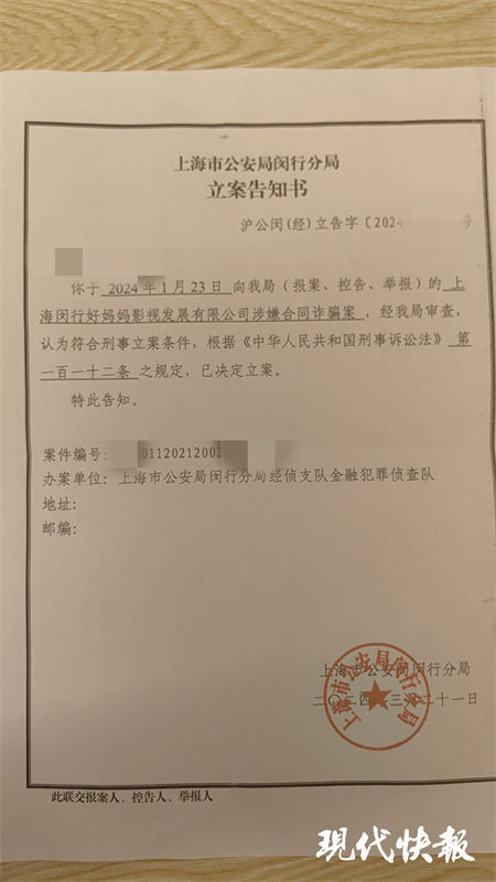 “立案了,我没白等。”3月29日,王云(化名)告诉现代快报记者,收到了上海市公安局闵行分局刑侦支队寄送的立案告知书,上面载明:上海闵行好妈妈影视发展有限公司涉嫌合同诈骗案,经审查,已决定立案。