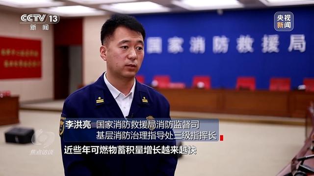 国家消防救援局消防监督司基层消防治理指导处三级指挥长 李洪亮:大风、高温、干旱少雨这样的天气是森林火险等级非常高的气象;第二个因素是可燃物的载量,近些年可燃物蓄积量增长越来越快,有的林区林下可燃物已经达到了20年的峰值;第三个因素就是火源因素,火源管理是我们现在的一个难点,马上进入清明了,这段时间达到了异常严峻的形势。