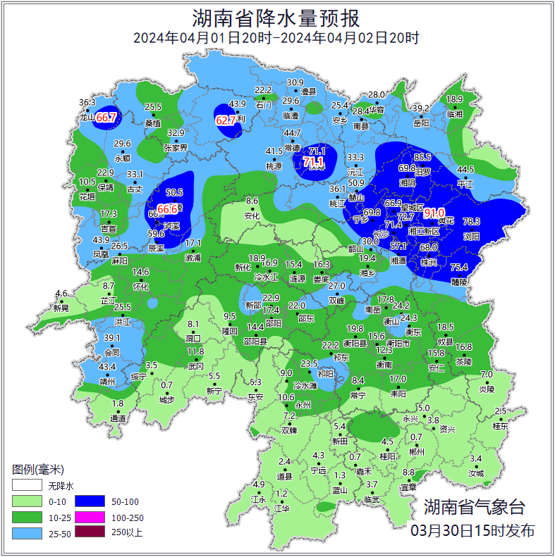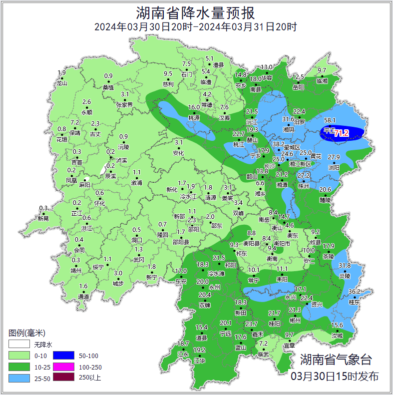 湖南省3月30日20时至3月31日20时降水量预报(央广网发图片来源:湖南省气象台)