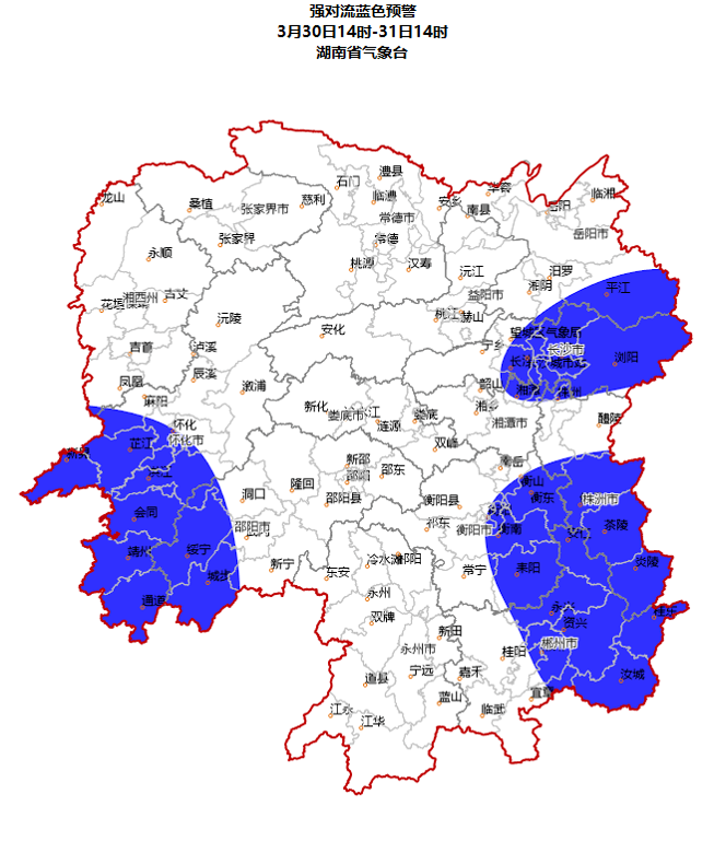 据湖南省气象台3月30日10时发布的强对流蓝色预警:预计30日下午至夜间,长沙、株洲、湘潭东北部、衡阳东部、邵阳西南部、岳阳东南部、郴州、怀化将出现8-10级雷暴大风或冰雹天气,并伴有局地短时强降水,请加强防范。