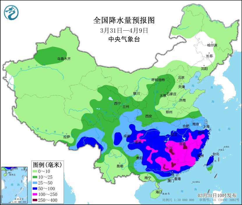 从中央气象台3月31日发布的中期预报看,4月4日到4月6日,我国江南、华南中北部及贵州东部等地有中到大雨,局部地区有暴雨或大暴雨;西北地区东部、四川盆地、青藏高原东部有小雨。