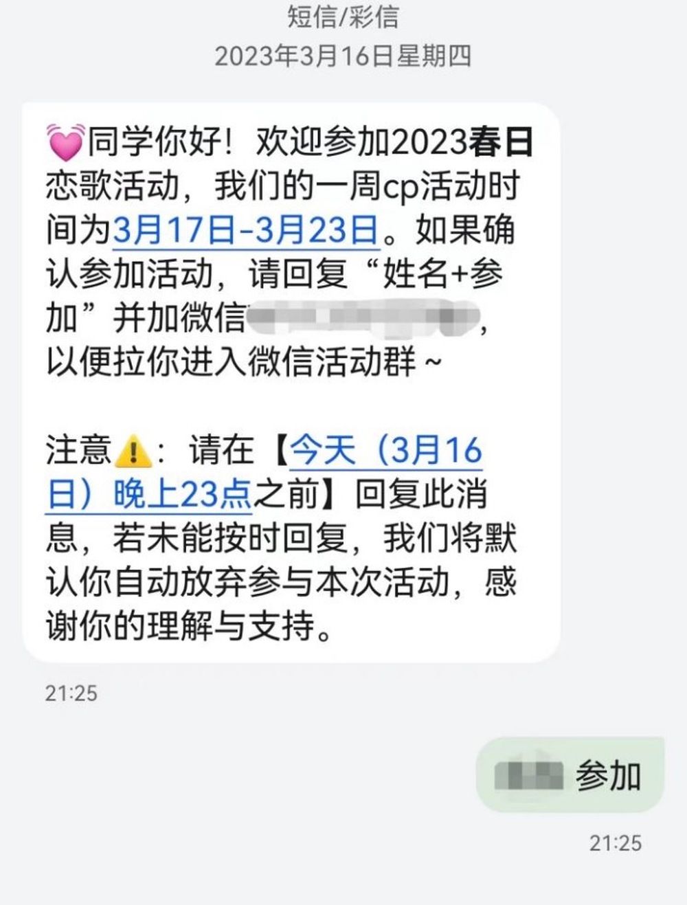 匹配成功后,主办方会以短信等方式进行通知,参与者则需加“月老”微信等建立联系,再经由“月老”添加上CP的联系方式并进入活动群,开始每日任务打卡。