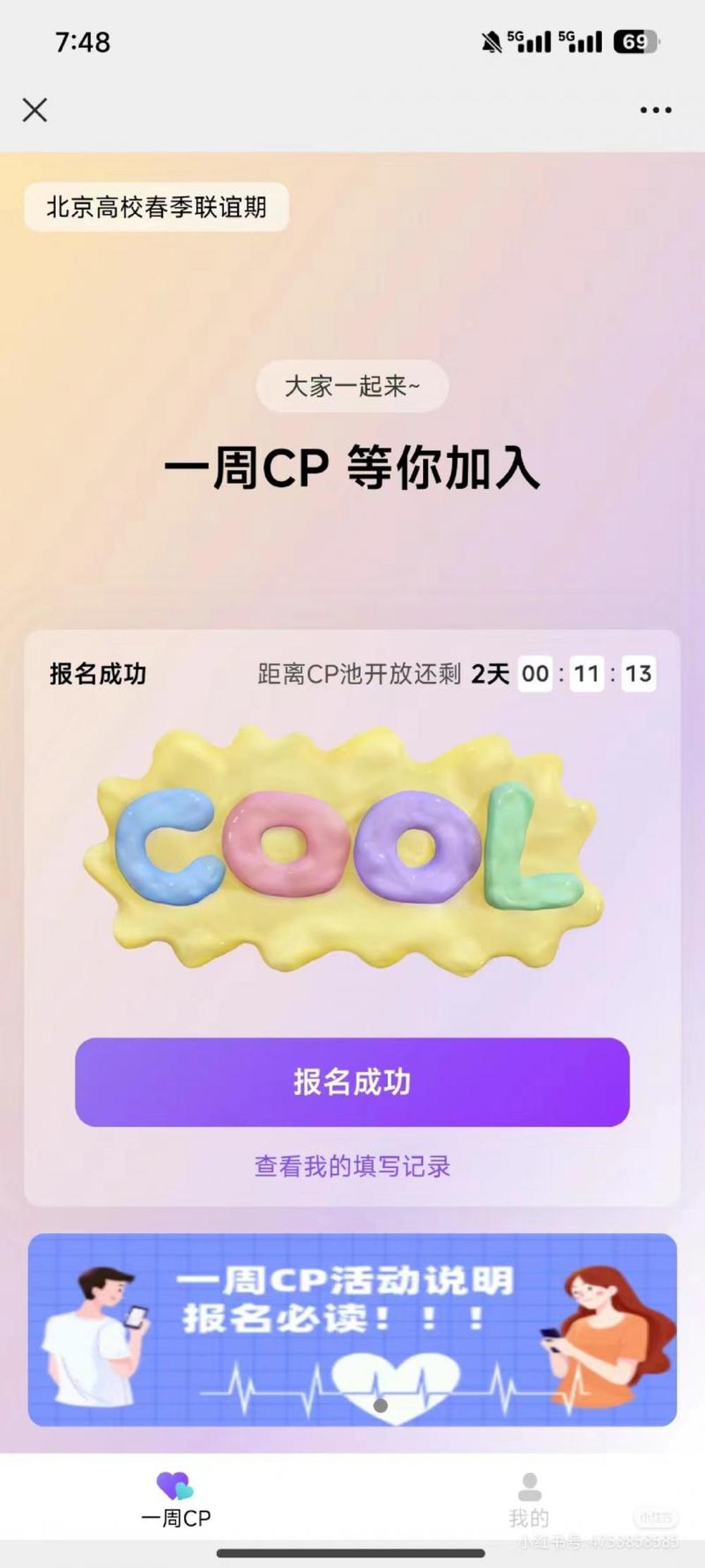 “一周CP”是一种流行于各大高校的、基于陌生异性之间配对机制的社交活动。这一活动通常由高校的学生会或研究生会组织,不同的学院甚至学校之间都可以相互联谊。