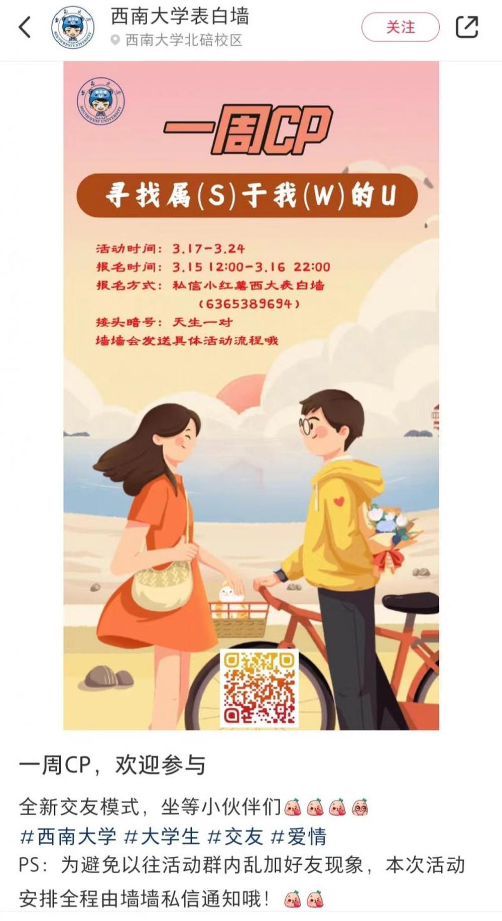 经历近8年的发展,“一周CP”已成高校学生联谊活动经常采用的一种线上交友方式。