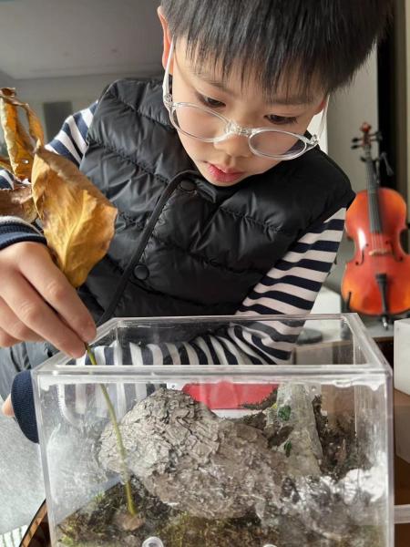 不同于普通孩子对虫子避之唯恐不及的态度,2岁时,走路还跌跌撞撞的李於言就展露出了对昆虫浓厚的兴趣,发现一个蚂蚁窝能趴上好几个小时,蹲在草丛边观察蜗牛起来浑然忘我,甚至每每出门都要带几只小昆虫回家。等上了幼儿园,他开始跟身边的小伙伴介绍身边常见的昆虫,讲解起来滔滔不绝。