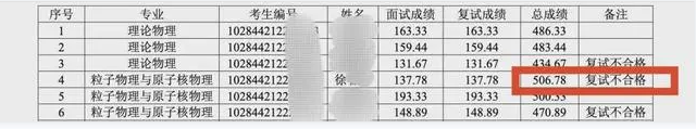 >>4月2日,一则“考研生成绩第一被备注不合格”的消息引发网友关注。在南京大学物理学院公示的信息中,考生徐某某的初复试总成绩相加为506.78分,位于粒子物理与原子核物理专业第一名。不过,在其姓名后面,学校备注了“复试不合格”。