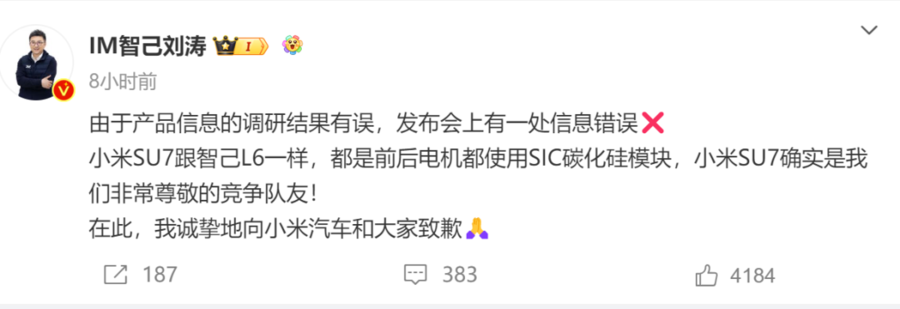 随后,智己联席CEO刘涛表示:“由于产品信息的调研结果有误,发布会上有一处信息错误。小米SU7跟智己L6一样,都是前后电机都使用SIC碳化硅模块,小米SU7确实是我们非常尊敬的竞争队友!在此,我诚挚地向小米汽车和大家致歉。”