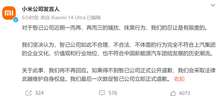 随后,小米公司发言人表示,“对于智己公司近期一而再、再而三的骚扰、抹黑行为,我们的忍让是有限度的。我们坚决认为,智己公司如此不合理、不合法、不体面的行为完全不符合上汽集团的企业文化、价值观和行业地位,也不符合中国新能源汽车团结发展的历史潮流。关于此事,我们将不再回应。如果得不到智己公司正式公开道歉,我们会采取法律武器维护自身权益。我们最后一次敦促智己公司立即正式道歉。”