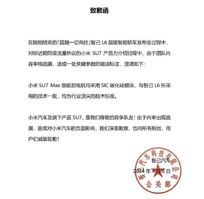 4月9日凌晨,智己汽车发布致歉函。智己汽车称,在刚刚结束的“超越一切向往”智己L6超级智能轿车发布会过程中,对标近期同级流量热议的小米SU7产品力介绍过程中,由于团队内容审核疏漏,造成一处关键参数的错误标注,澄清如下: