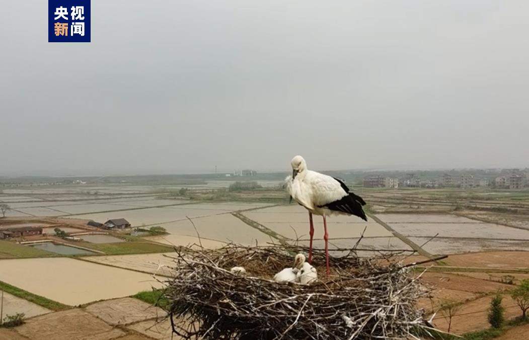 近日,在江西鄱阳,3只东方白鹳幼鸟在高压铁塔鸟巢成功孵化出壳,这是鄱阳湖湿地今春首批自然繁育的东方白鹳幼鸟。
