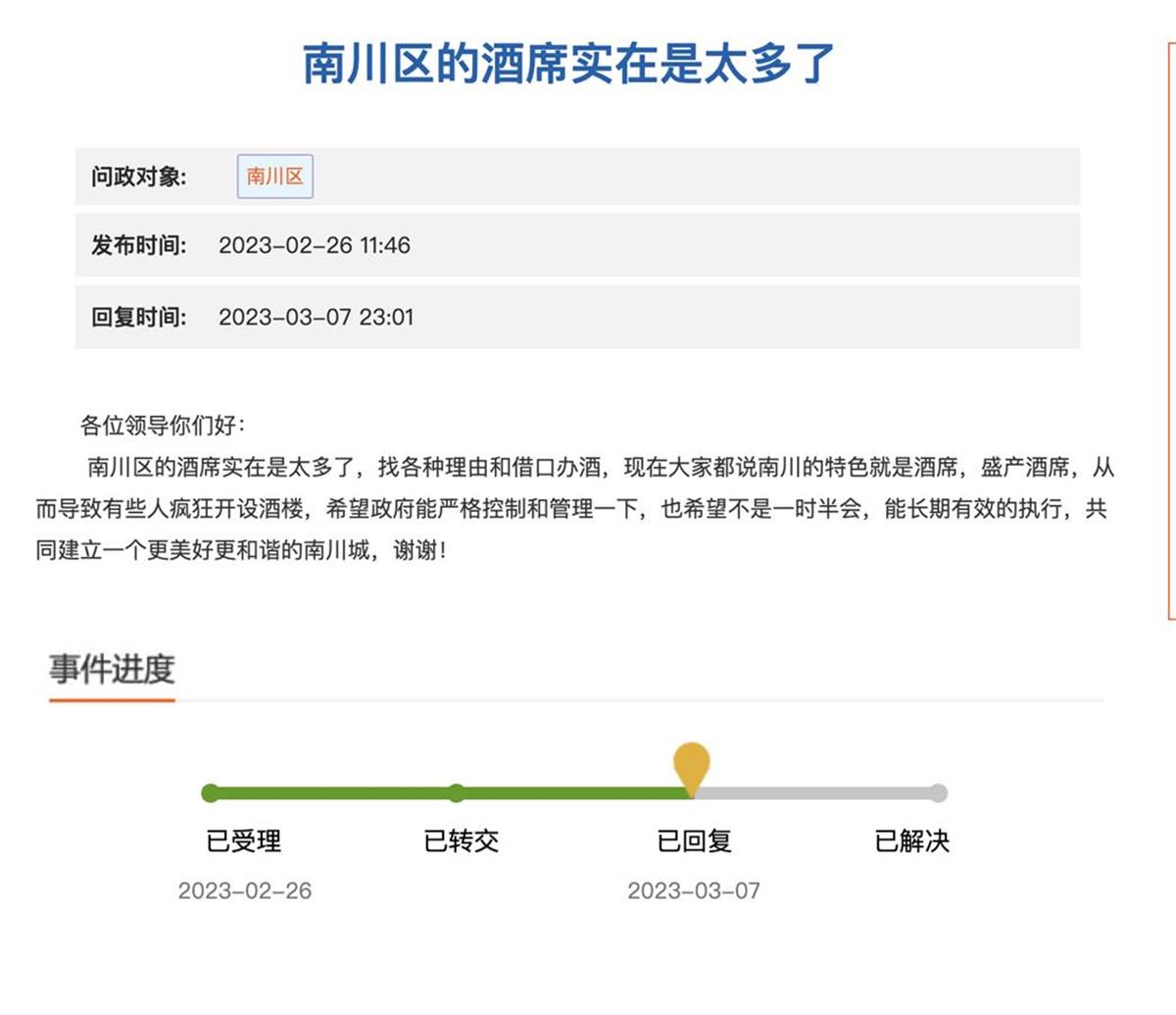 2023年2月,有网友反映:南川区的酒席实在是太多了,找各种理由和借口办酒,现在大家都说南川的特色就是酒席,从而导致有些人疯狂开设酒楼,希望政府能严格控制和管理一下,且能长期有效执行。