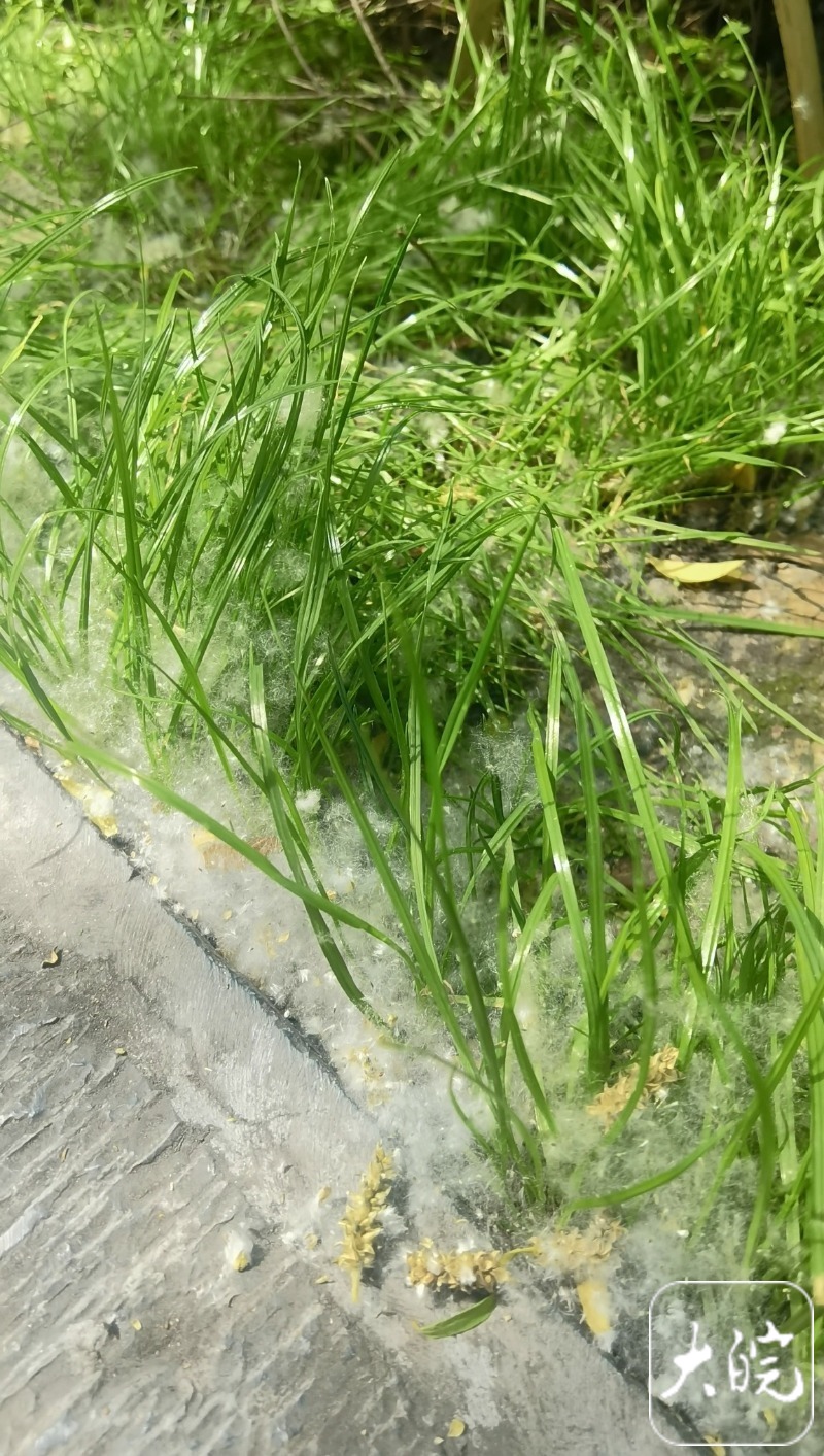 落在草坪上堆积的柳絮。