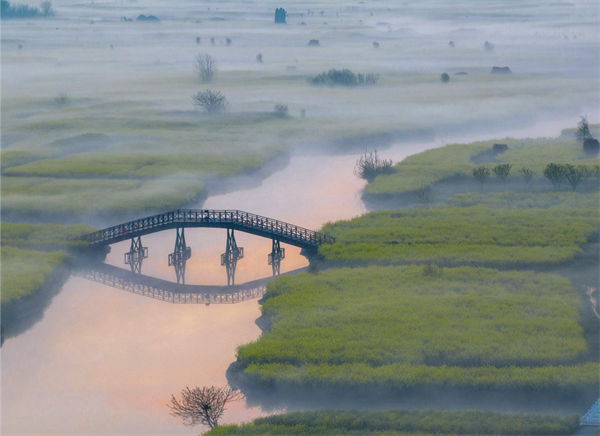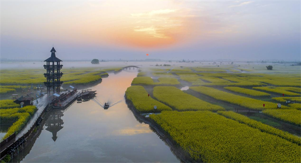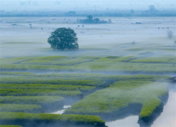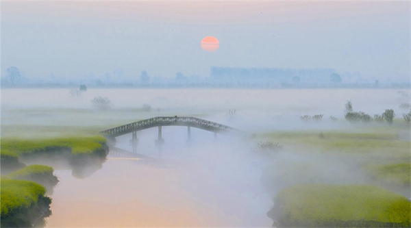 当平流雾邂逅垛上花,倾刻幻化成一幅幅水墨画。初春时节,江苏兴化市千垛景区的垛上油菜花争相绽放,尽显芳华。4月9日清晨,一场平流雾给千垛景区罩上了一层薄薄的轻纱,若隐若现的菜花如梦似幻,美轮美奂。(史道智)