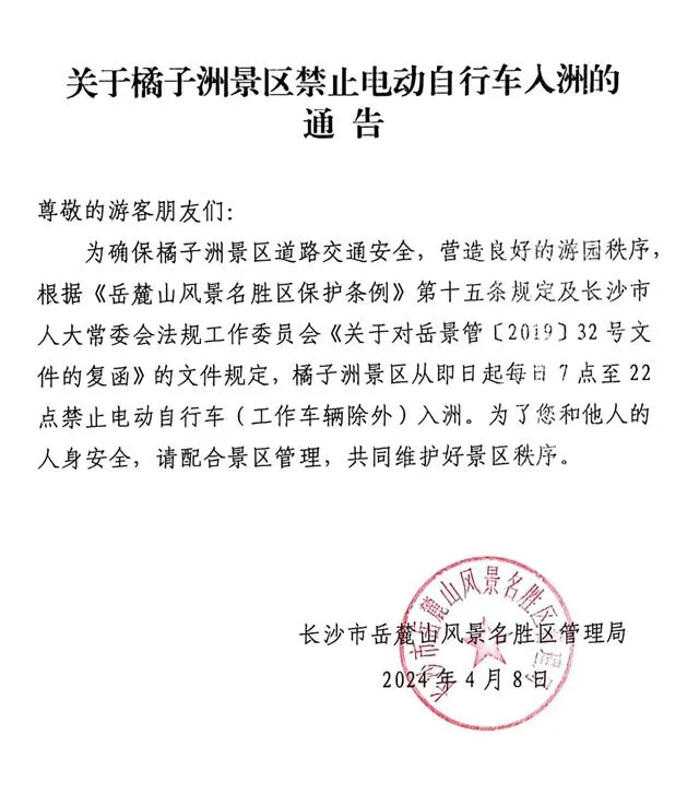 春暖花开,不少市民与家人、朋友走进橘子洲游园晒太阳,享受闲暇时光。为营造一个安全、舒适、有序的景区环境,聚焦加强公共休闲场地公众人身安全保障,经岳麓山风景名胜区管理局研究决定,自4月8日起,橘子洲景区每日7点至22点禁止电动自行车入洲。