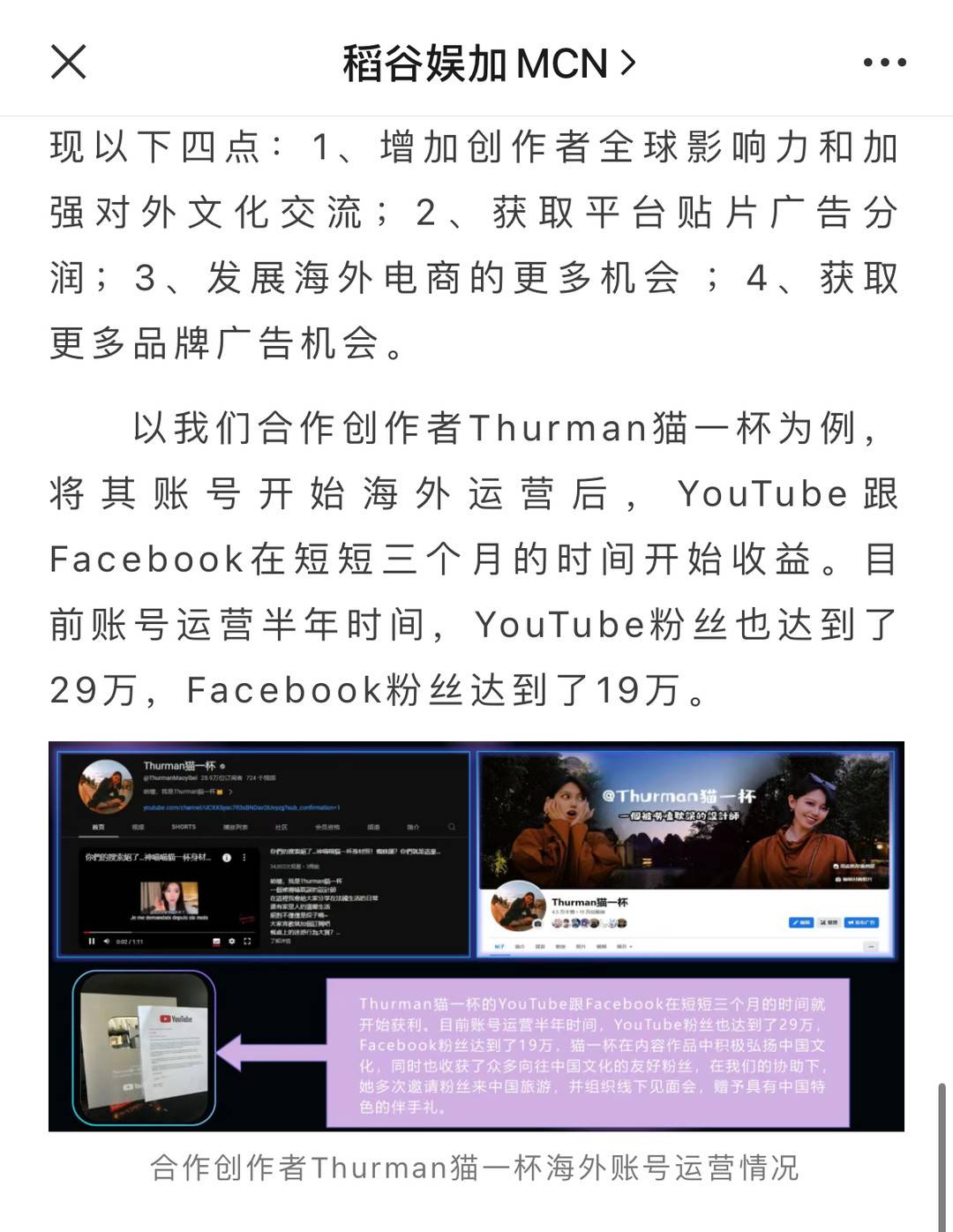 一般来说,MCN公司是“网红”的孵化和运营机构,作为网红背后的支持力量,通常负责内容策划、运营推广等工作。记者发现,涉事网红“猫一杯”短视频账号显示,“稻谷娱加”系与其合作的MCN机构。在稻谷娱加的一则推文中也描述到,“以我们合作的‘Thurman猫一杯’为例,我们将其账号在海外运营后,短短三个月时间就开始有了收益。”稻谷娱加称,2023年,公司被认定为广东省创新型中小企业。