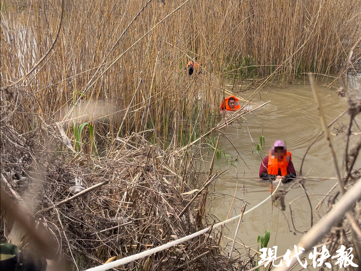 接到报警后,龙袍派出所民警潘杰带着3名辅警迅速赶往现场,潘杰和辅警们一路小跑到江边,看到报警的李大妈站在岸边,她指着前方芦苇荡焦急地说:“快,还有一个人不会水,被困在里面了。”只见一名50岁左右的女子在芦苇荡中,江水已经淹没到她的脖子位置。潘杰立即从车内拿出绳子,随后与辅警蔡飞麻利地脱去衣物,穿上救生衣,然后用绳子绑在身上,一步步走入水中。另外两名辅警和赶来的江边巡查人员站在岸上拉住绳子,下水后,潘杰小心翼翼地向前游动,靠近被困大妈。