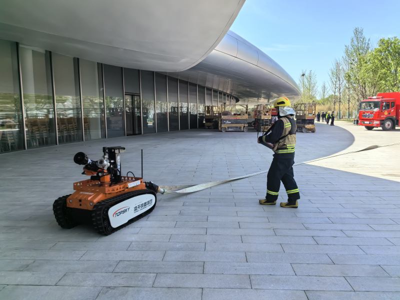 采石路消防救援站的消防员操作灭火救援机器人。图源:海淀区消防救援支队