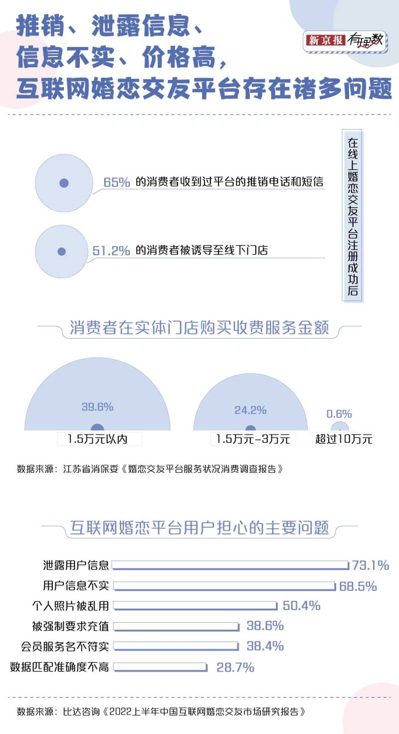 2021年9月,江苏消费者权益保护委员会发布了一份调查了世纪佳缘、珍爱网等5家头部平台的《婚恋交友平台服务状况消费调查报告》,里面指出,在平台注册成功后,超过6成消费者都收到过推销,超过一半被诱导至线下门店,线上平台已经成为了线下实体门店的引流工具。