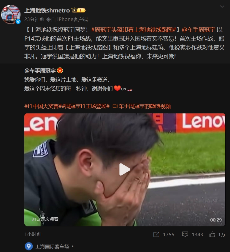 周冠宇主场首秀顺利完赛后,4月21日,上海地铁官方微博再次和周冠宇在社交平台上互动:“上海地铁祝福冠宇圆梦,周冠宇头盔印着上海地铁线路,以P14完成他的首次F1主场战,能突出重围进入围场着实不容易!首次主场作战,冠宇的头盔上印着上海地铁线路图和多个上海地标建筑,他说家乡作战对他意义非凡。冠宇说国旗是他的动力!上海地铁祝福你,未来更可期!”