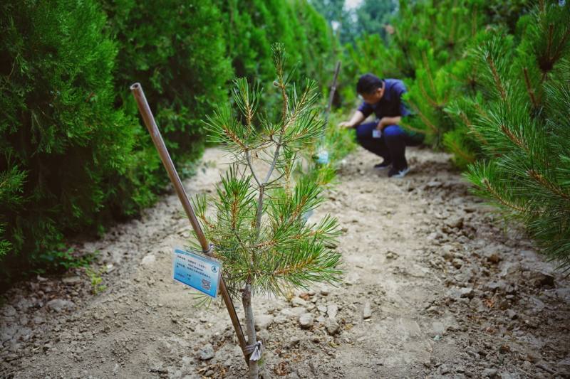 这些母株都赫赫有名,针叶古树区的代表是中山公园辽柏、北海公园“白袍将军”、戒台寺抱塔松等等,其中“九搂十八杈”立于密云区新城子镇,主干周长达9.3米,要9个人伸臂合围才能抱拢,其树冠是由18个大杈组成,因此得名。这棵古树高达25米,但其后代还很“袖珍”——它是2021年繁殖成活并移栽到这里的,只有1米多高,看起来健康可爱。中山公园的辽柏历经千年风霜,其克隆苗6年前栽植时不足30厘米高,现在已成长成3米多高的大树。
