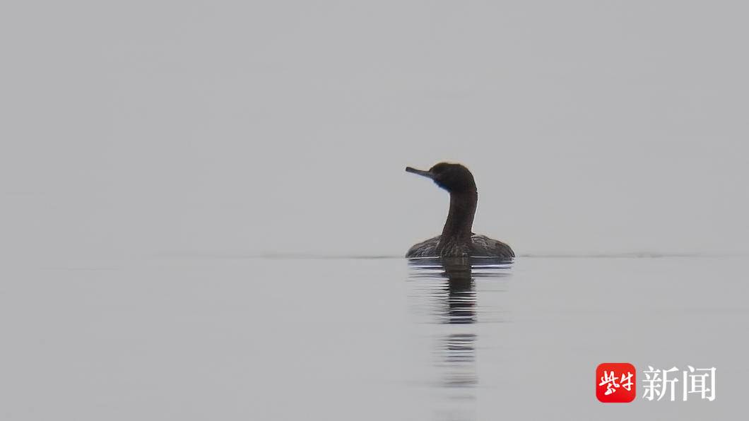 2023年12月13日下午,江苏省南通环境监测中心生态观测团队在南通市启东长江口(北支)湿地省级自然保护区内观察并拍摄到1只游禽。它通体乌黑、嘴较为细长而稍微侧扁,头上没有羽冠,颈部也没有白色细羽,体型类似普通鸬鹚但明显偏小。经查询文献并对比其形态特征后,鉴定为海鸬鹚幼鸟,并确定该物种为江苏省鸟类分布新纪录。