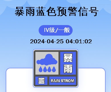 04月25日03时58分,厦门市气象台发布暴雨蓝色预警信号:过去2小时集美区灌口镇已出现25毫米以上的降水,预计未来4小时我市部分镇街及近海仍有20~40毫米的降水。请注意防范强降水引发的城市内涝、山洪地灾等次生灾害。