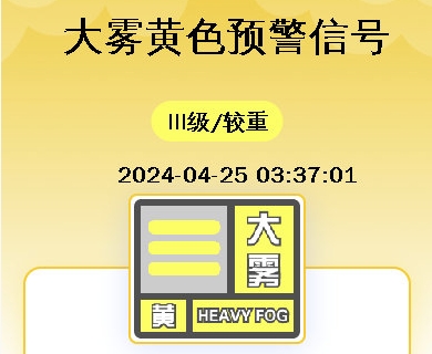 04月25日03时35分,厦门市气象台发布大雾黄色预警信号:预计未来12小时我市的部分镇街及近海将出现能见度低于500米的大雾天气。请注意防范低能见度天气对交通航运等的不利影响!