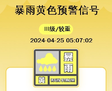04月25日05时01分,厦门市气象台将暴雨蓝色预警信号升级为暴雨黄色预警信号:过去1小时海沧区东孚街道已出现25毫米以上的强降水,预计未来2小时海沧区全区、湖里区全区、思明区全区、集美区(灌口镇、杏滨街道、杏林街道、集美街道、侨英街道)、翔安区(凤翔街道、新店街道、香山街道、大嶝街道、金海街道)累计雨量仍有20~40毫米,其余镇街有10~30毫米,请注意防范!